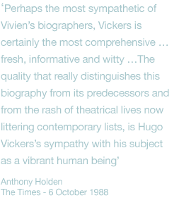 Hugo Vickers also examined Vivien's film and stage career, writing of her as a person and not as the 'property' of a film company or a name on a contract. He examined her films and drawing on a great number of interviews with famous figures of the stage, he recreated her part in the life of English theatre in the 1940s and 1950s. An important feature of the book is, of course, her love for Laurence Olivier and their twenty year marriage, so much of it made difficult by recurring bouts of tuberculosis and manic depression. Hugo Vickers, drawing on many hours of conversation with her devoted friend, the actor John Merivale, explained how Vivien re-established her life after the divorce.